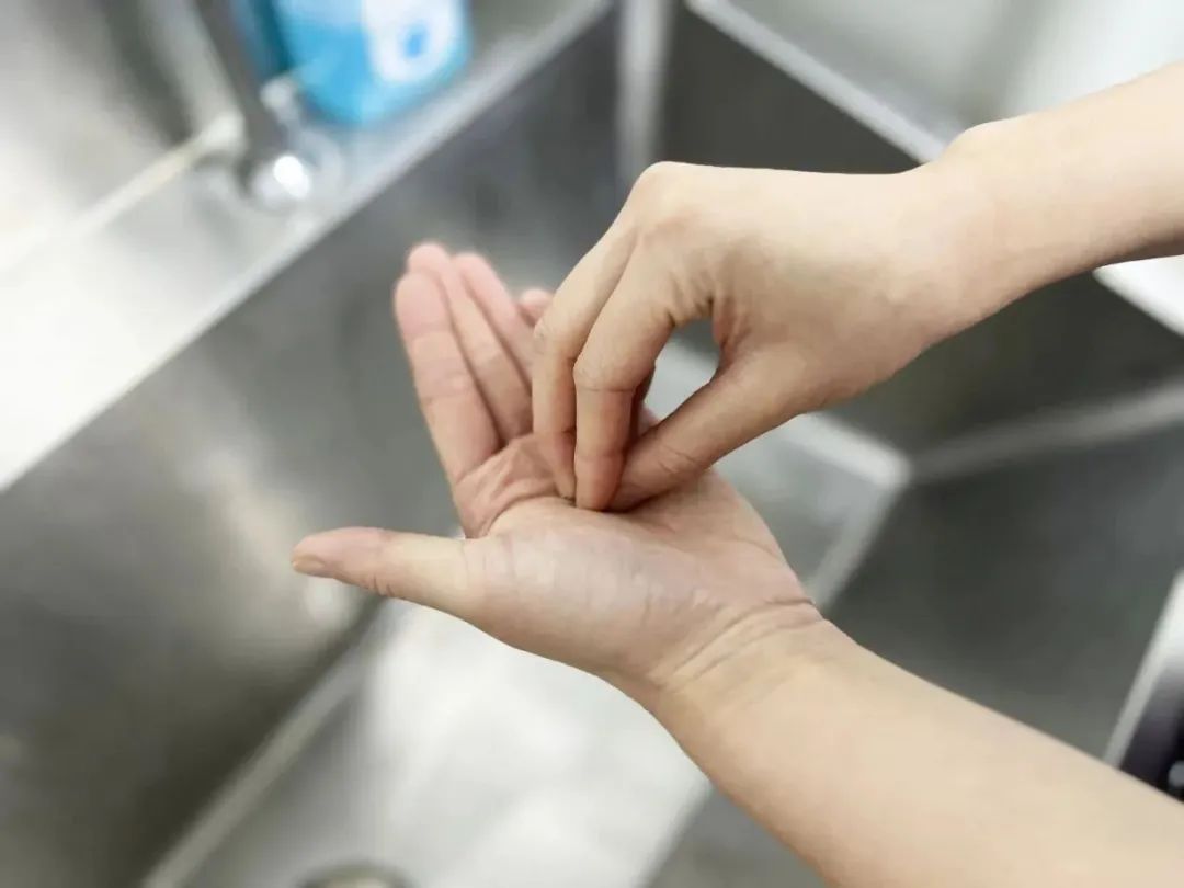 將五個手指尖并攏放在另一個手掌心旋轉揉搓,交換進行。